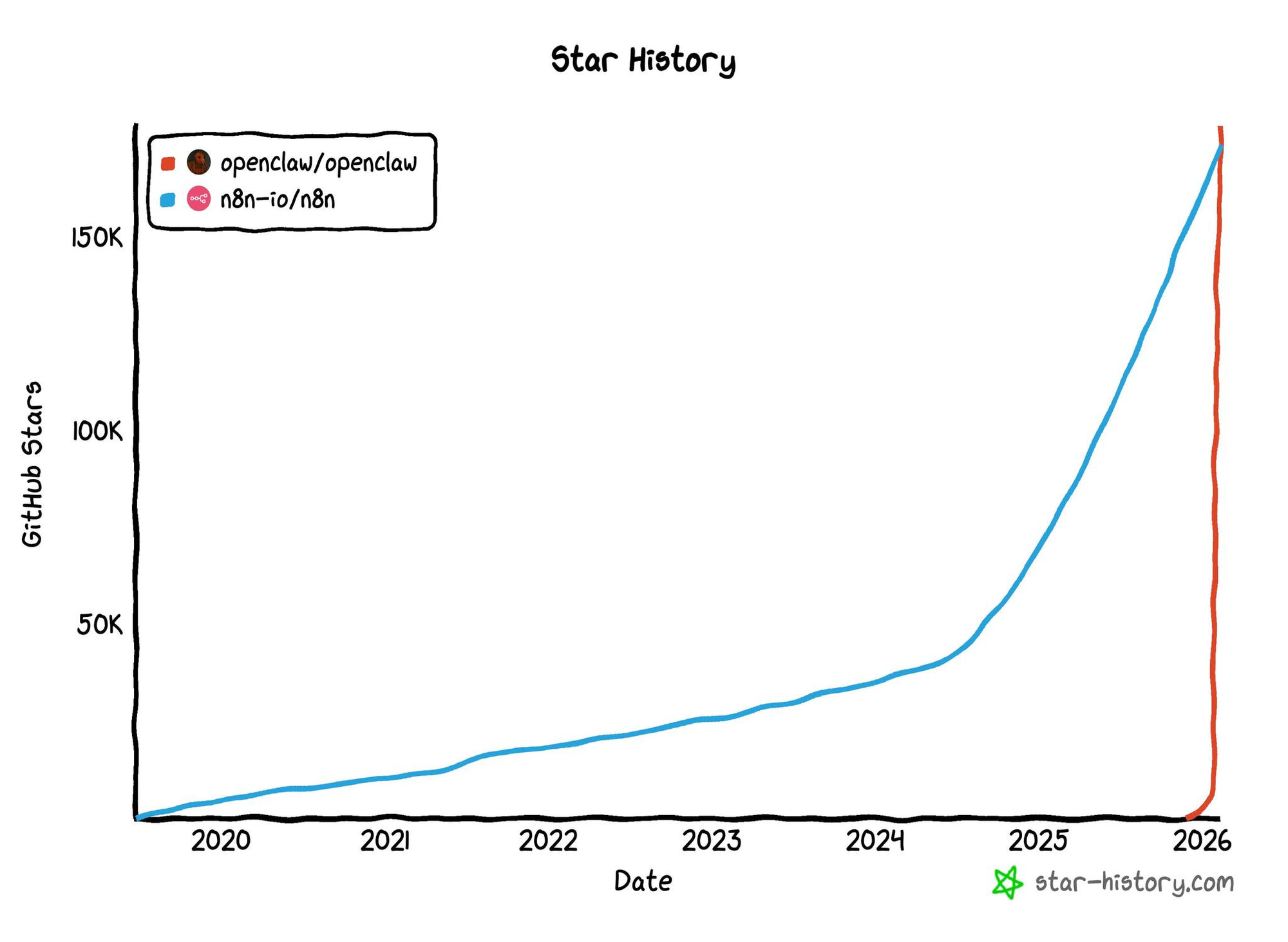 相較於 n8n,OpenClaw 爆炸性的成長速度 👆